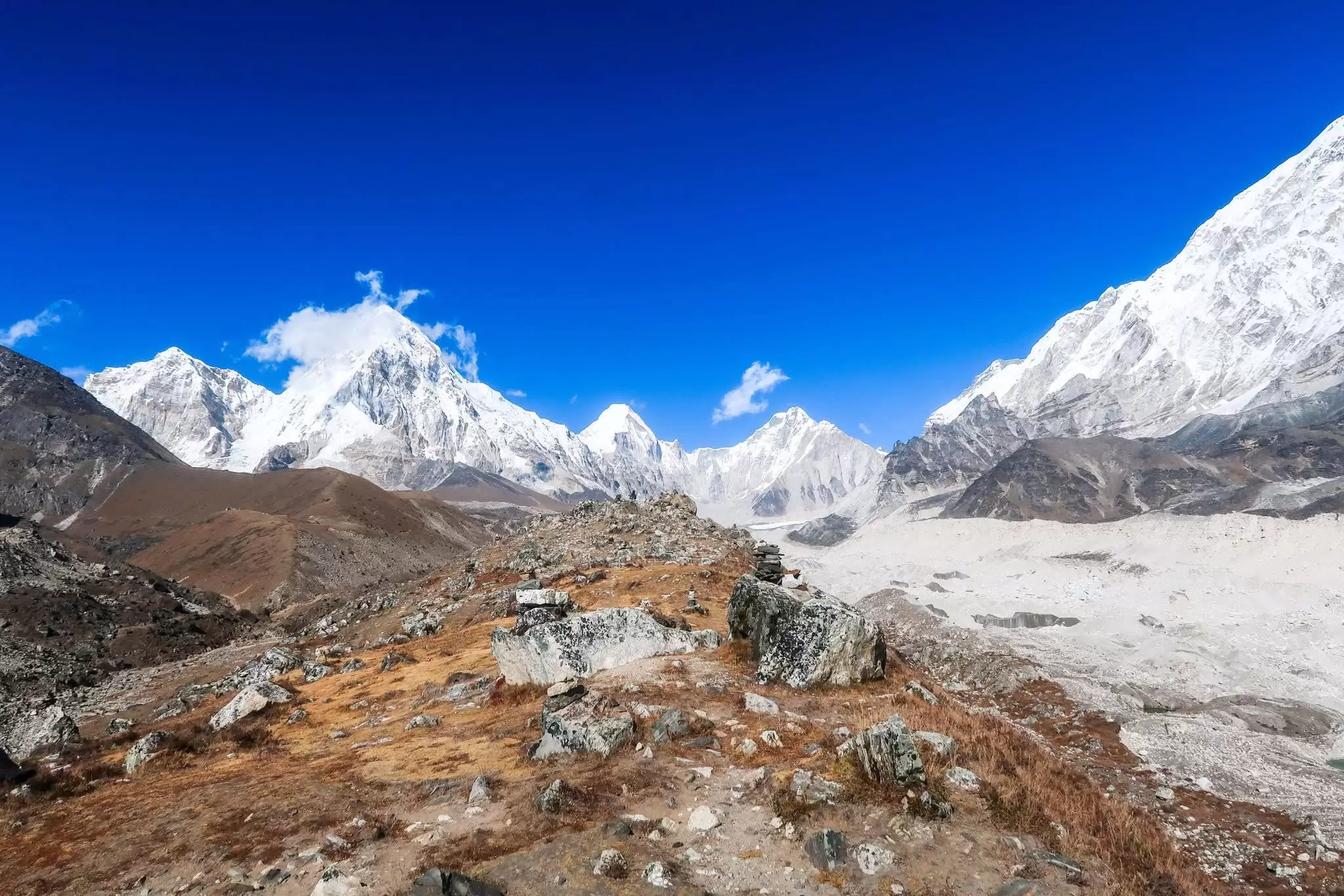 Today’s trek takes you higher into the Khumbu valley, as you make your way to Lobuche. The trail ascends gradually through a rocky landscape, with views of towering peaks like Pumori and Nuptse. The walk is strenuous, and the thin air at this altitude can make breathing a bit more difficult. You’ll arrive in Lobuche after about 5-6 hours of trekking. Here, you'll rest and prepare for the final push to Everest Base Camp.